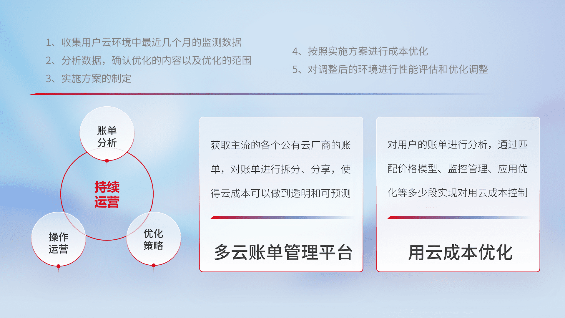 通过多云纳管,,,,以统一的资源数据模型把客户的云资源进行抽象和封装,,,进而实现对多云资源的统一操作,,,保障云资源管理的可靠性、、、、稳定性与可用性。。。。量身定制化运维内容,,,,配置、、、、开发运维、、补丁管理、、备份、、、监控、、认证和访问管理、、、、审计和日常巡检等,,,保障在用云过程中的可靠度,,稳定度以及高可用率。。